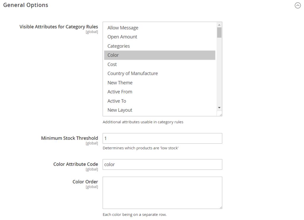 The setting of the Visual Merchandiser sets the attributes that can be used in the merchandising window as well as the minimum stock requirement. The setting also specifies the color attribute and the order of color values.