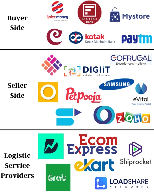 | Seller Side | eSamudaay, Digiit, Go Frugal Technologies, Growth Falcons, Sansung, PetPooja, eVital, NowFloats, Enstore, Zoho, GlobalLinker, Sellerapp, etc. |
